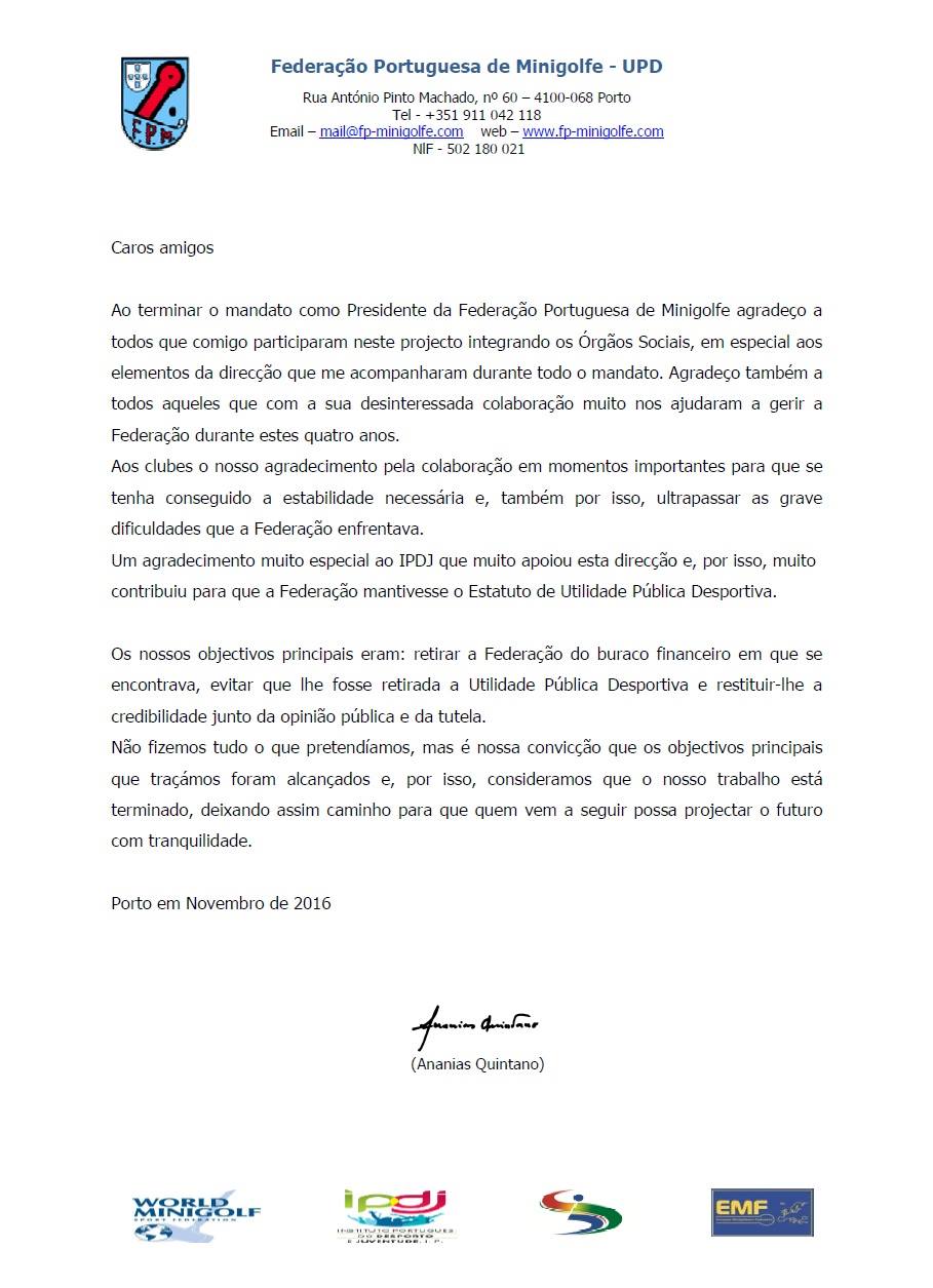 Entretanto pode ler-se na página de facebook da Federação Portuguesa de Minigolfe (FPM) a carta aberta de Ananias Quintano, que termina agora o mandato de 4 anos à frente da FPM.